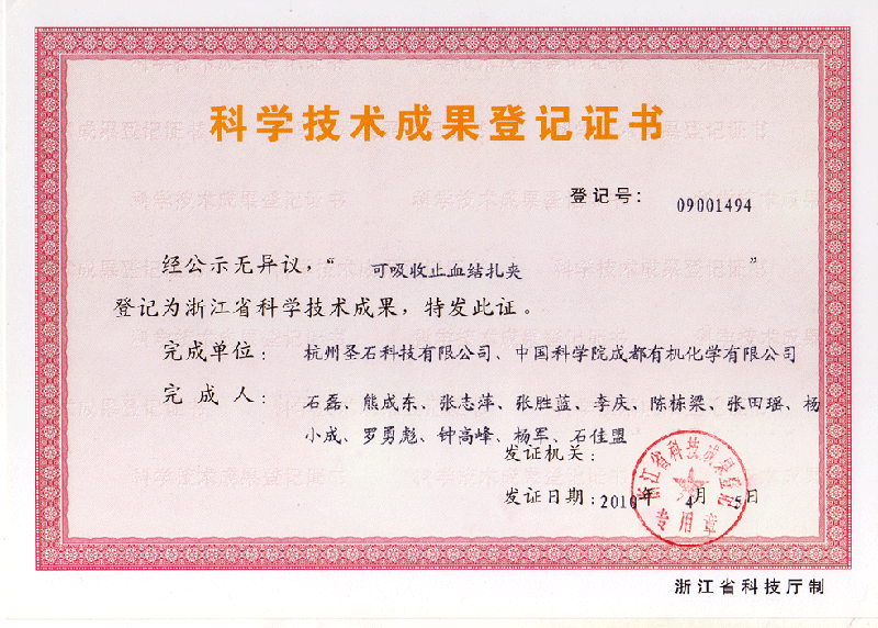 近日,我司研制產品“可吸收止血結扎夾”獲得浙江省科技廳頒發的科學技術成果登記證書。這一證書的獲得,標致著該產品已得到了省級政府部門的認可,此舉為我司產品取得更高的榮譽奠定了堅實的基礎。